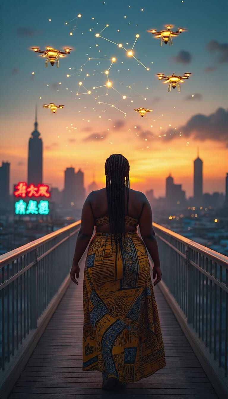 A powerful image of a Black woman on a vibrant skybridge market at dusk. Luminous drones and neon calligraphy adorn a pan-African futurist cityscape under a saturated sky.