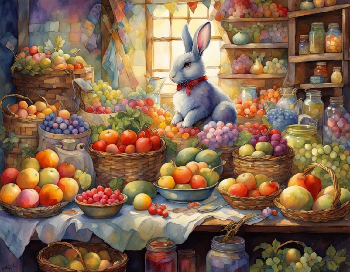 This image shows a whimsical farmers market scene with anthropomorphic bunnies selling produce. The artwork is rendered in a watercolor style with patchwork elements, evoking a cute, fantasy aesthetic.