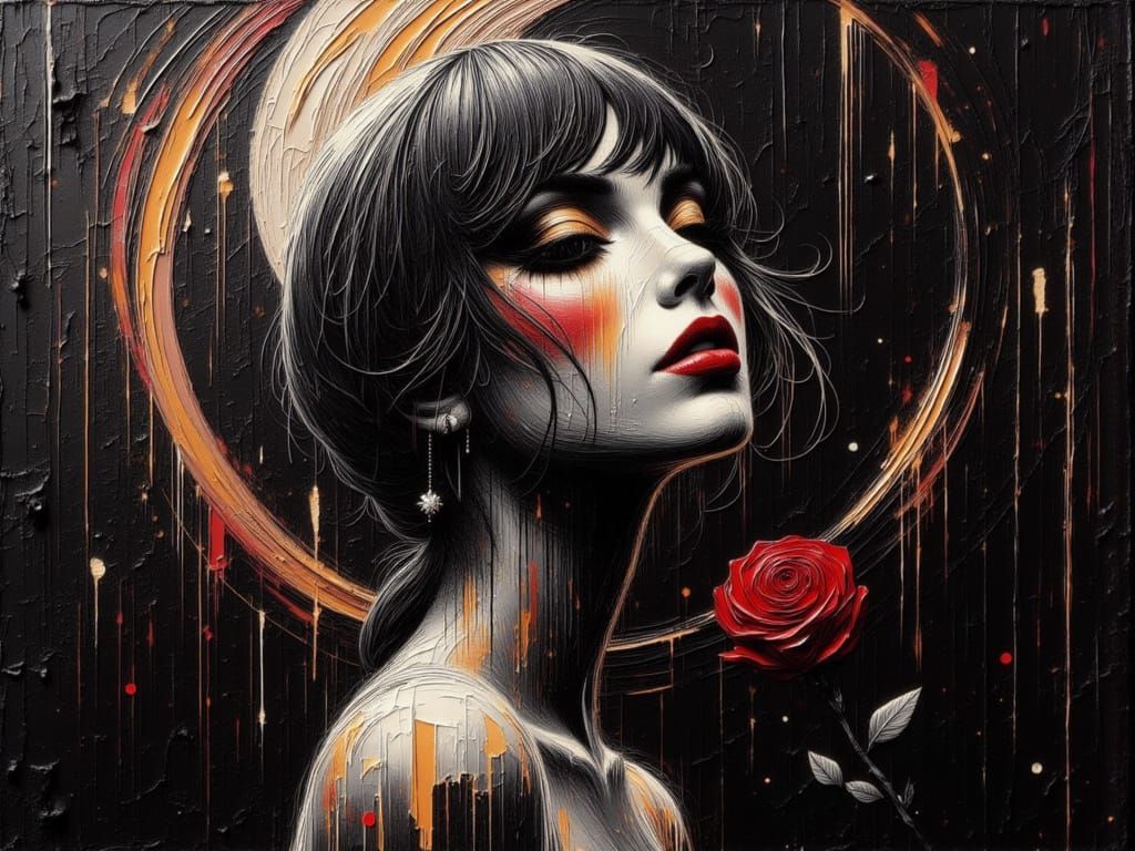 This image features a minimalist female model with abstract brushstrokes and iridescent zen lines on a black background, created in an oil on canvas style.