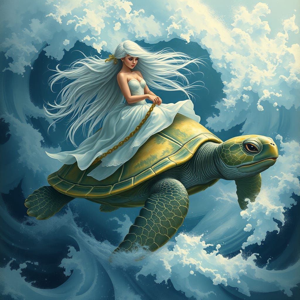 A nymph with long white hair and yellow eyes rides a giant sea turtle over the submerged ruins of Atlantis. She wears a flowing silver and gold gown in this digital art.
