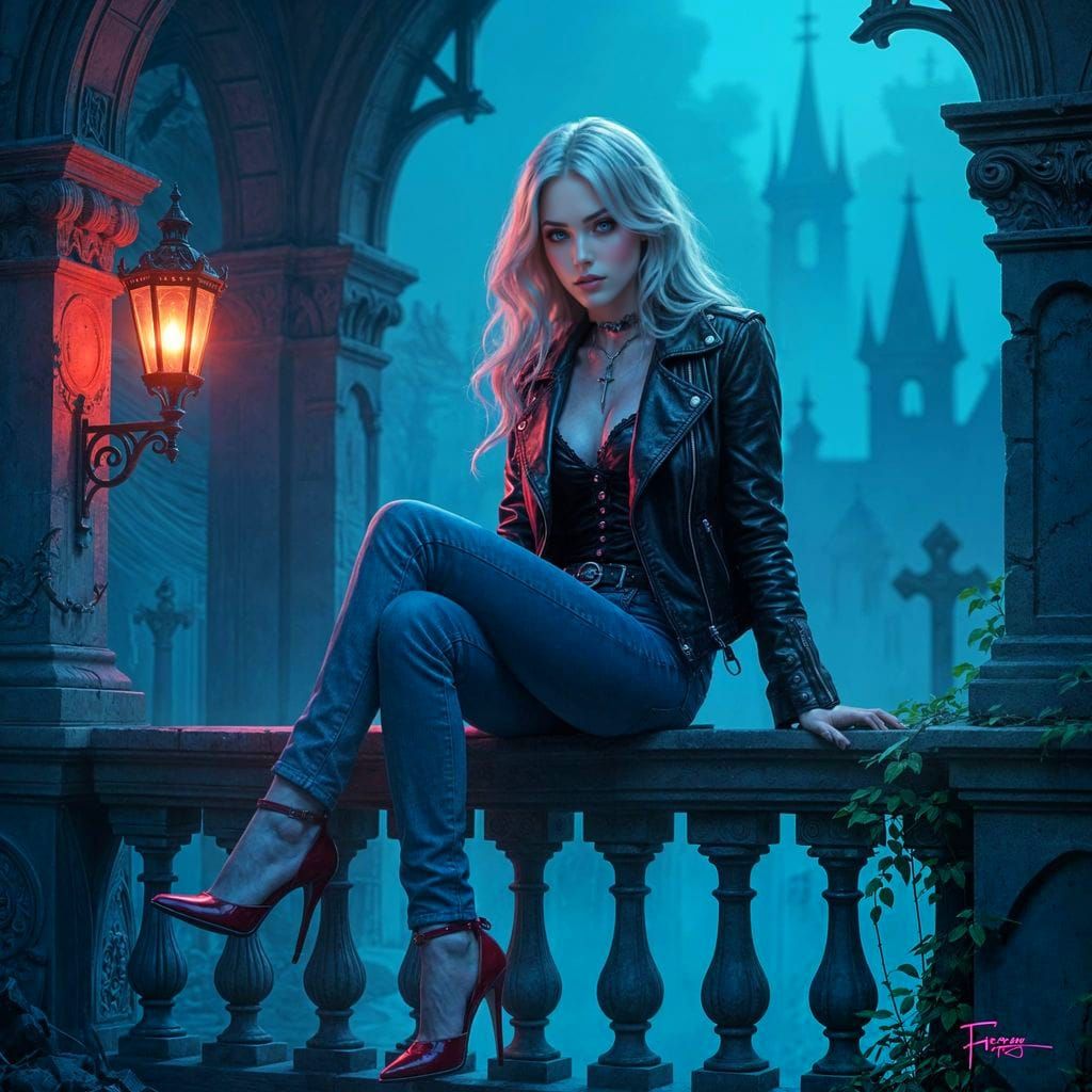 This image shows a beautiful vampire girl with dark eyes and pale skin, standing on a gothic balcony. A misty, neon-lit graveyard surrounds her, rendered in detailed concept art with atmospheric gothic elements.