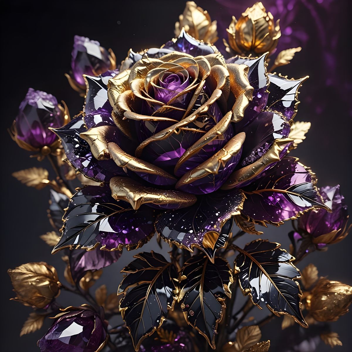 Maximalist macro shot gold trimmed amethyst and obsidian rose with black crystal leaves of epic proportions, a masterpiece rendered in cycles, most complex crystalline rose ever imagined global lighting, gold detailing, backlit, fantasy concept art, vignette, hyperdetailed, intricately detailed, dynamic ...
