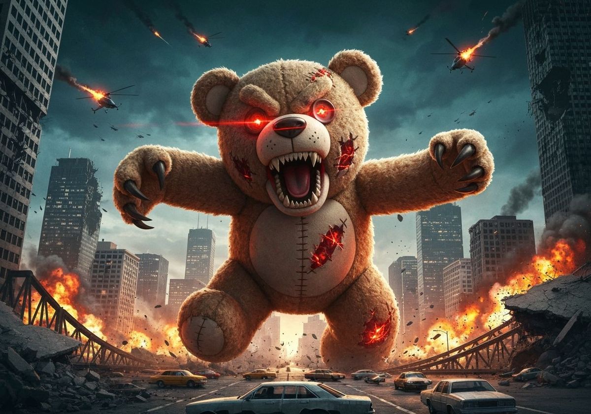 This image depicts a colossal, enraged teddy bear destroying a city. Its eyes glow red, and massive claws tear through buildings as it stomps through rubble. Explosions light the chaotic night scene.