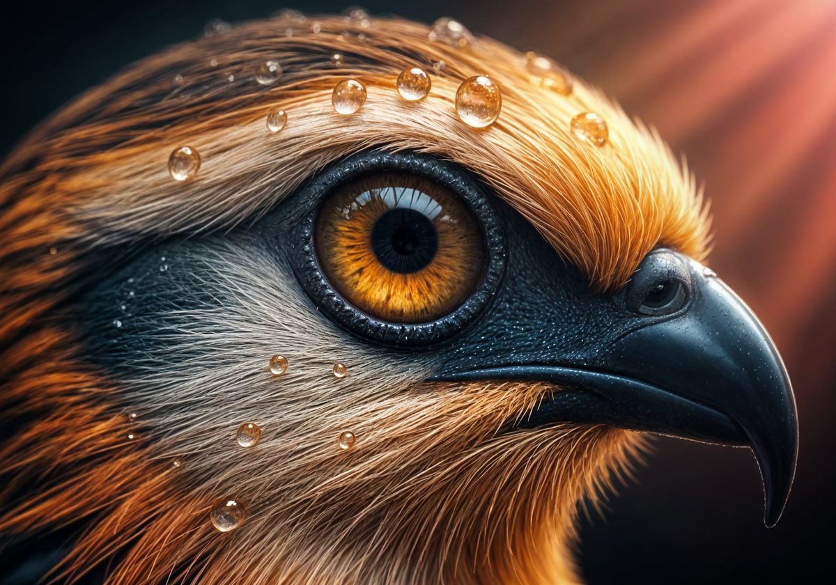 A striking picture of a bird with dew drops covering its head and eyelashes. The macro photograph captures the bird's eye in great detail, enhanced by soft, ethereal lighting and pink bokeh.