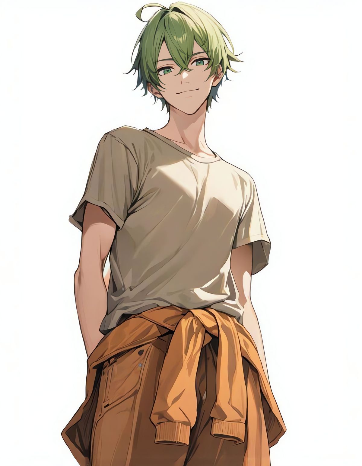 This image shows a young man with short green hair and green eyes in casual attire. He stands against a plain white backdrop, looking directly at the viewer with a slight smile.