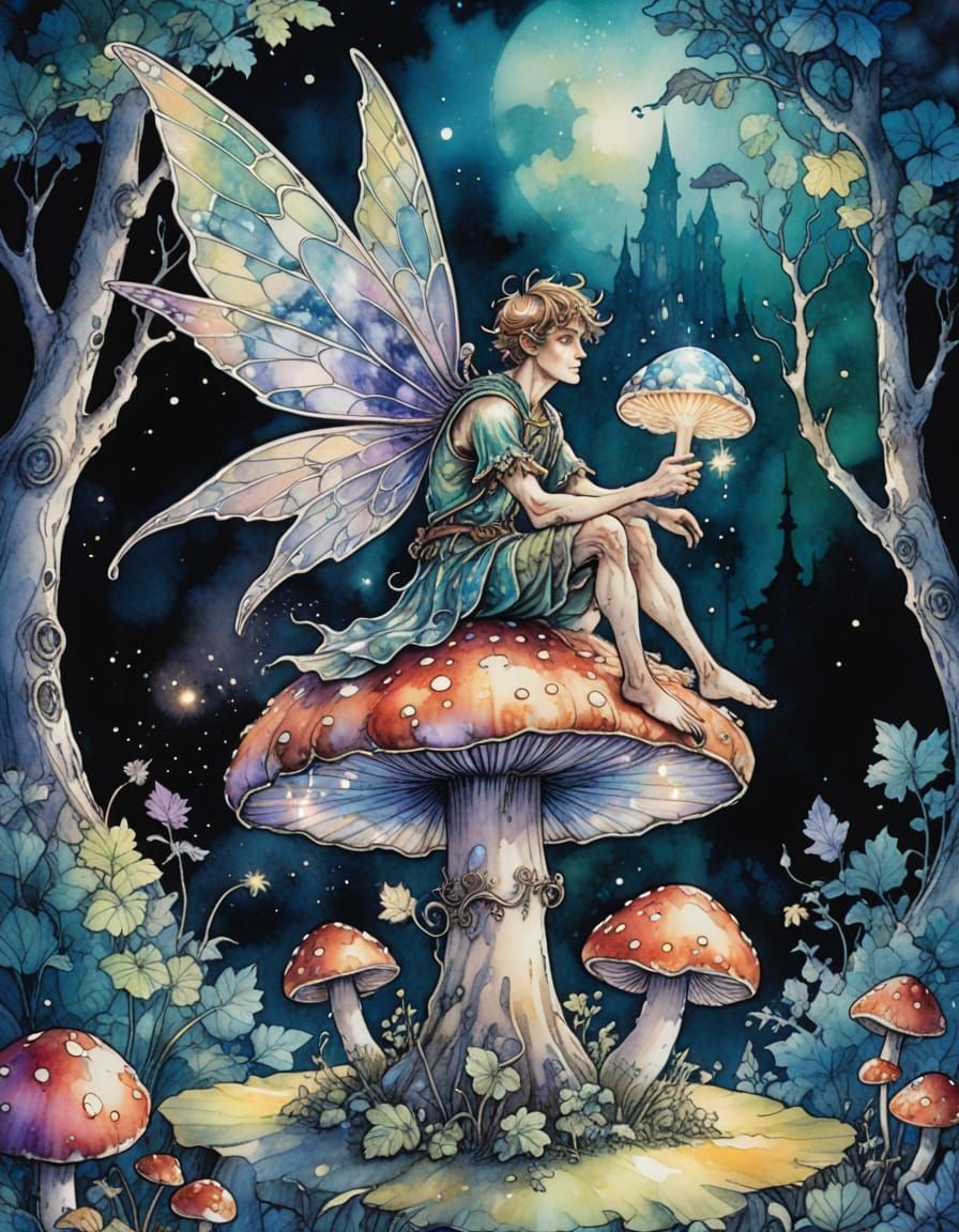 A vibrant watercolor illustration of a male fairy with stained glass wings, perched on a mushroom. The image features glowing light particles, soft mist, and ornate, whimsical details in a fairycore aesthetic.
