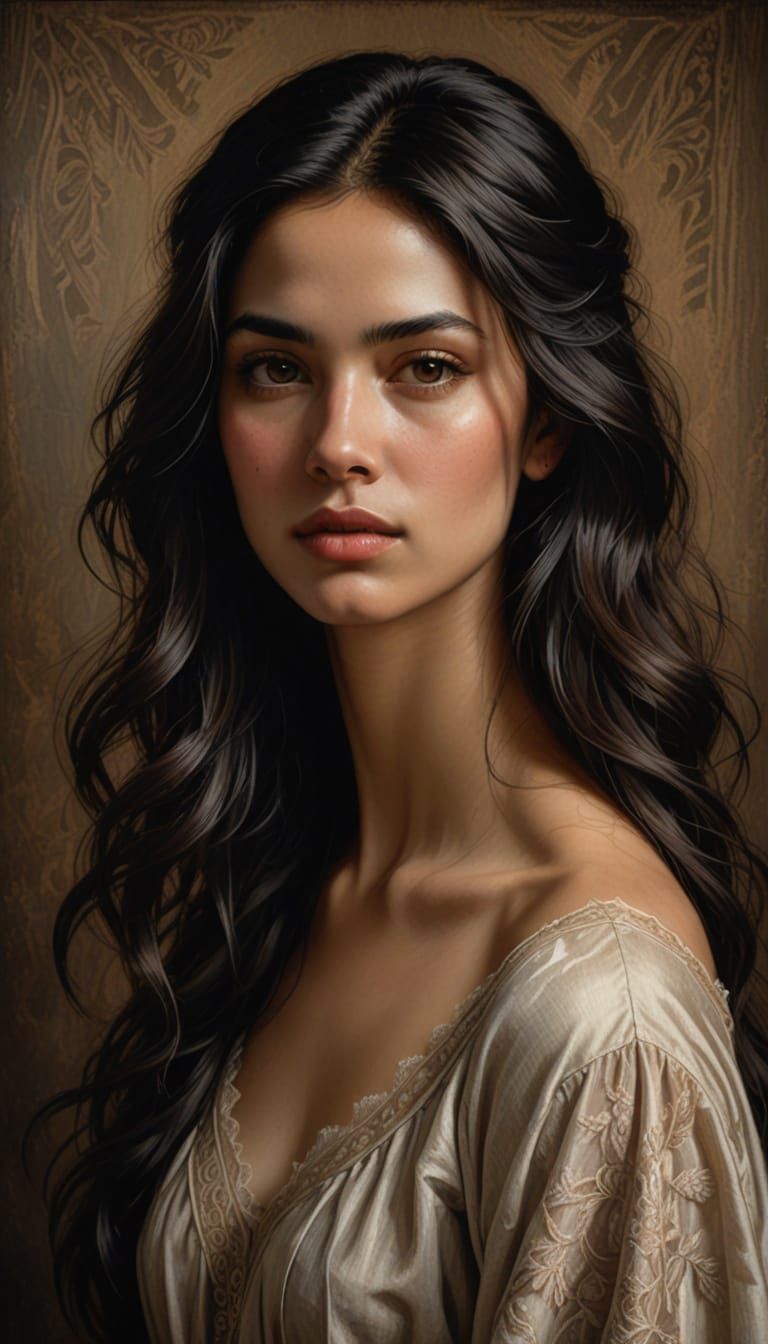 This oil painting features a 23-year-old Mexican woman with long black hair and an athletic build, depicted in the style of Renaissance portraiture with soft textures and warm, diffused lighting.