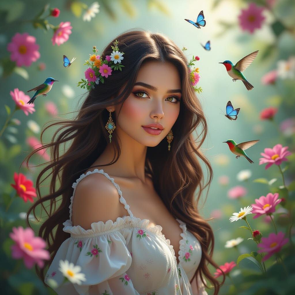 A serene woman with flowing hair adorned with flowers stands amidst a vibrant, floral backdrop. Birds and butterflies flutter around her, creating an enchanting, harmonious scene of nature