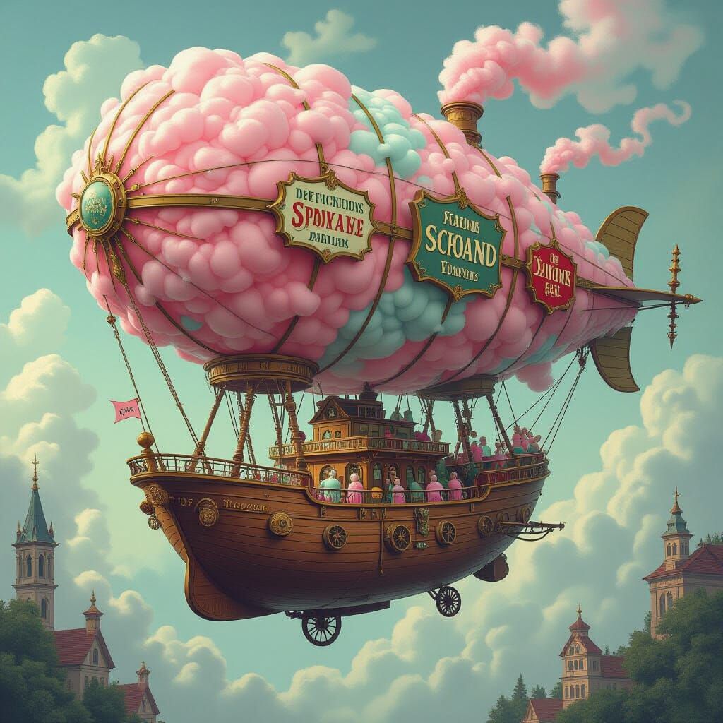 This image shows a cotton candy shop on an airship in a 50s vintage advertisement style. The scene has eerie horror elements and muted pastel colors, as 19th century engraving art.