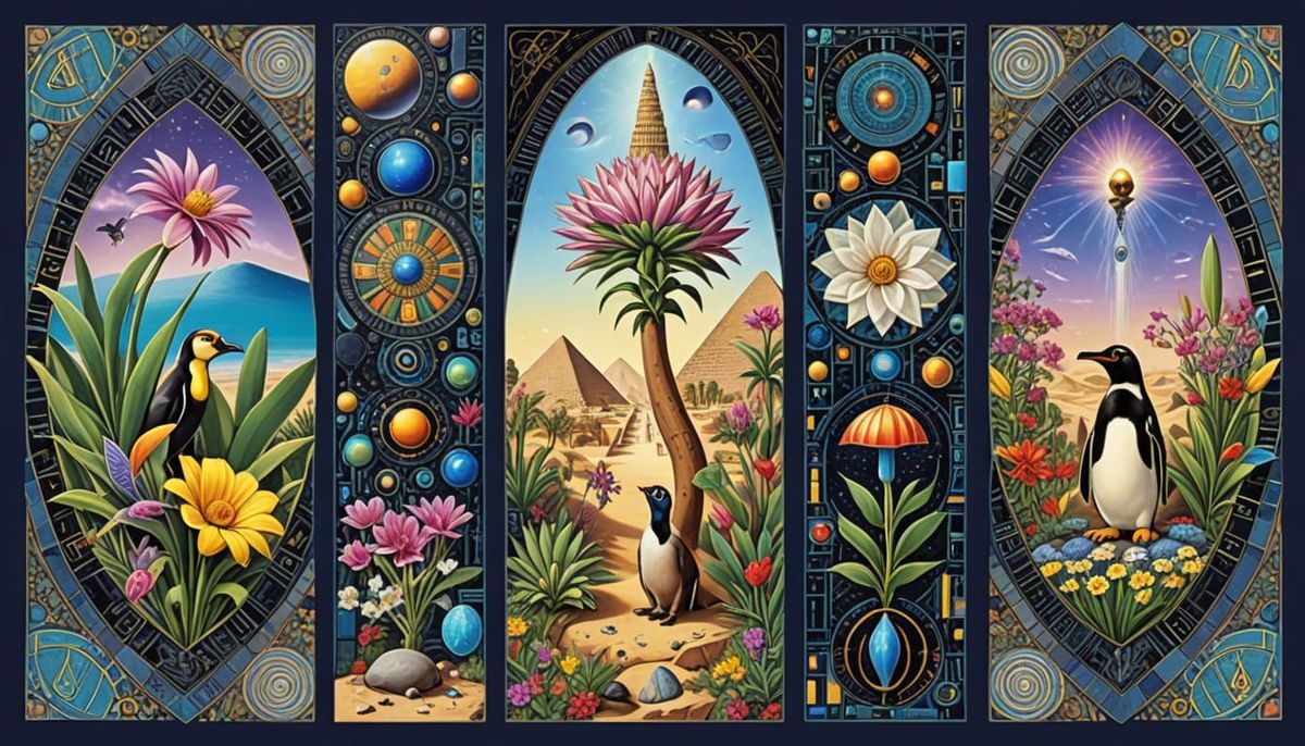 This striking image depicts a mystical secret garden, blending Egyptian grandeur with surrealist flair, featuring vibrant flora amidst a backdrop of timeless urban mystery.