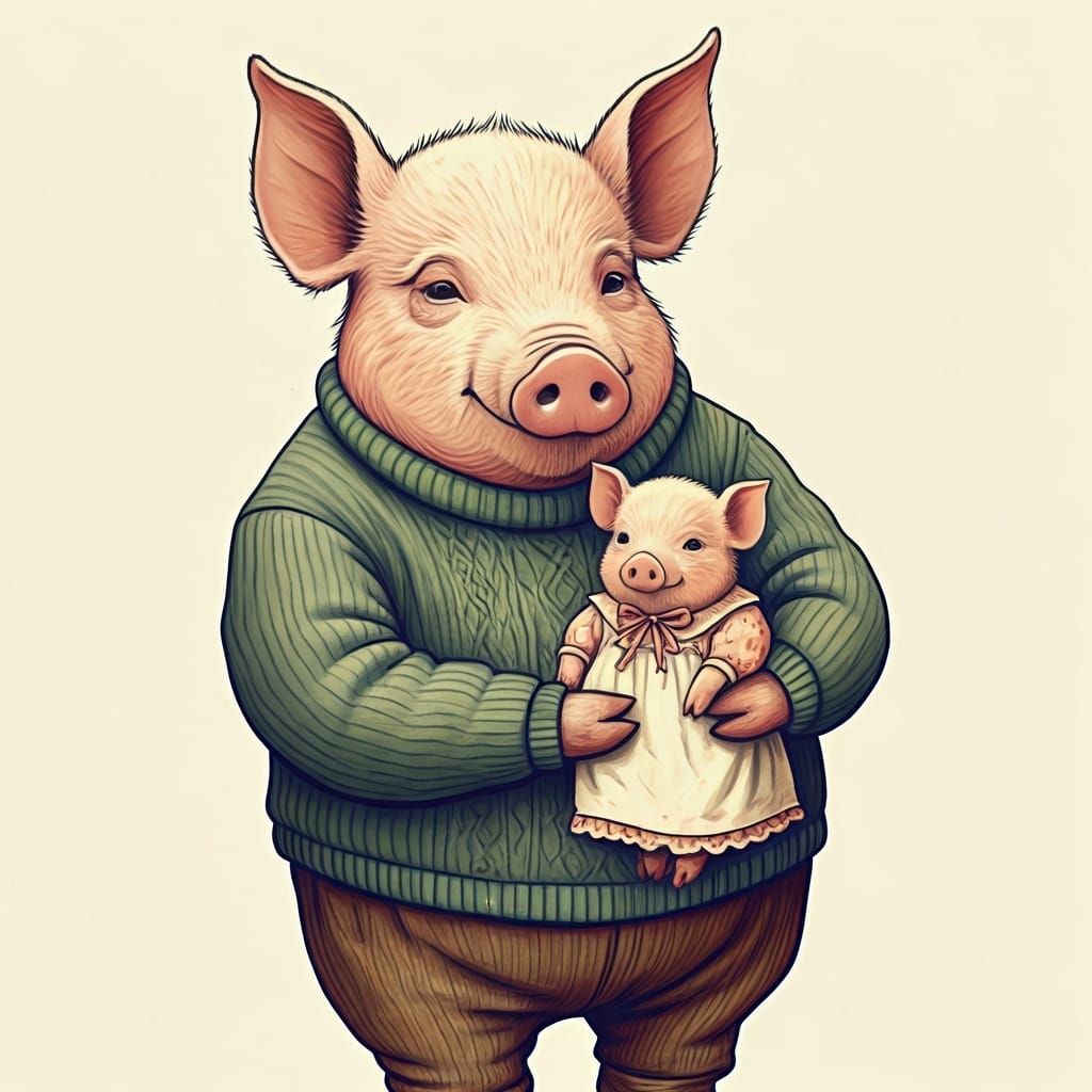This image shows a tender moment between a father pig and his daughter. The illustration is reminiscent of classic children's book art, with watercolor textures and whimsical details.