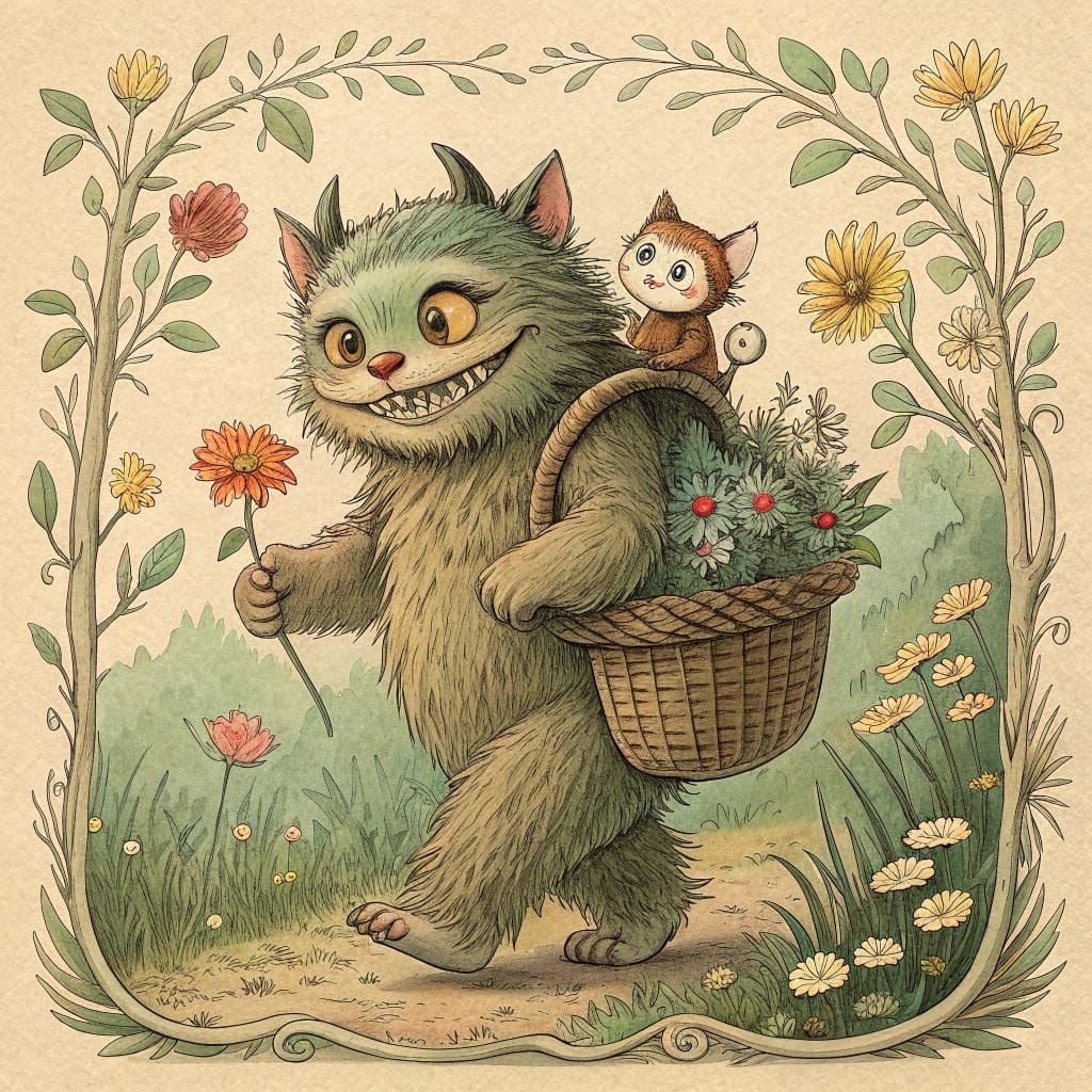 Another day of using the same prompt in multiple models. This time I made five different images, because why not? Inspired by a fragment of a half-remembered dream. In the dream, I wanted to take a picture of the monster & kitten together...