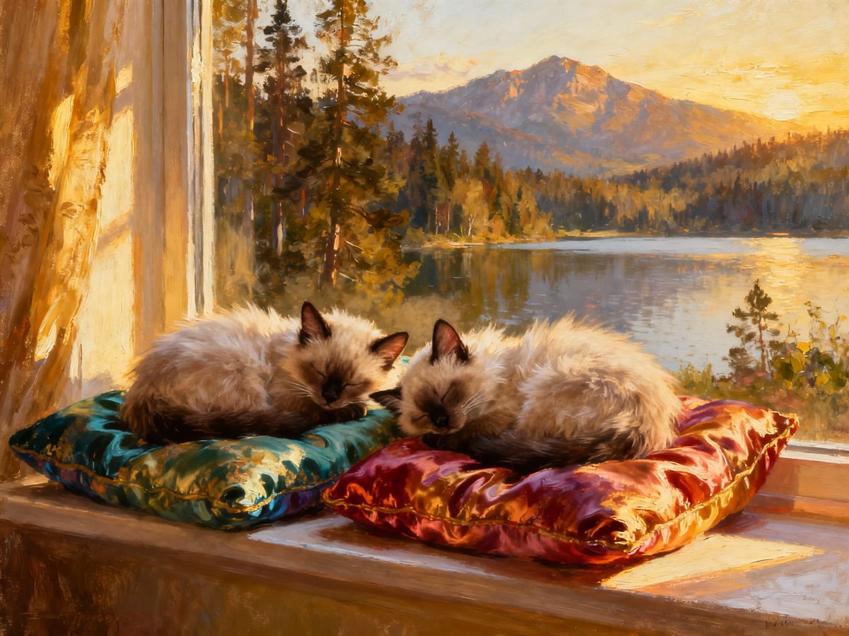This image shows two adorable, fluffy Siamese kittens sleeping soundly on vibrant silk cushions. The scene is set by a windowsill, with a beautiful view of a forest, lake, and mountains bathed in warm sunshine.