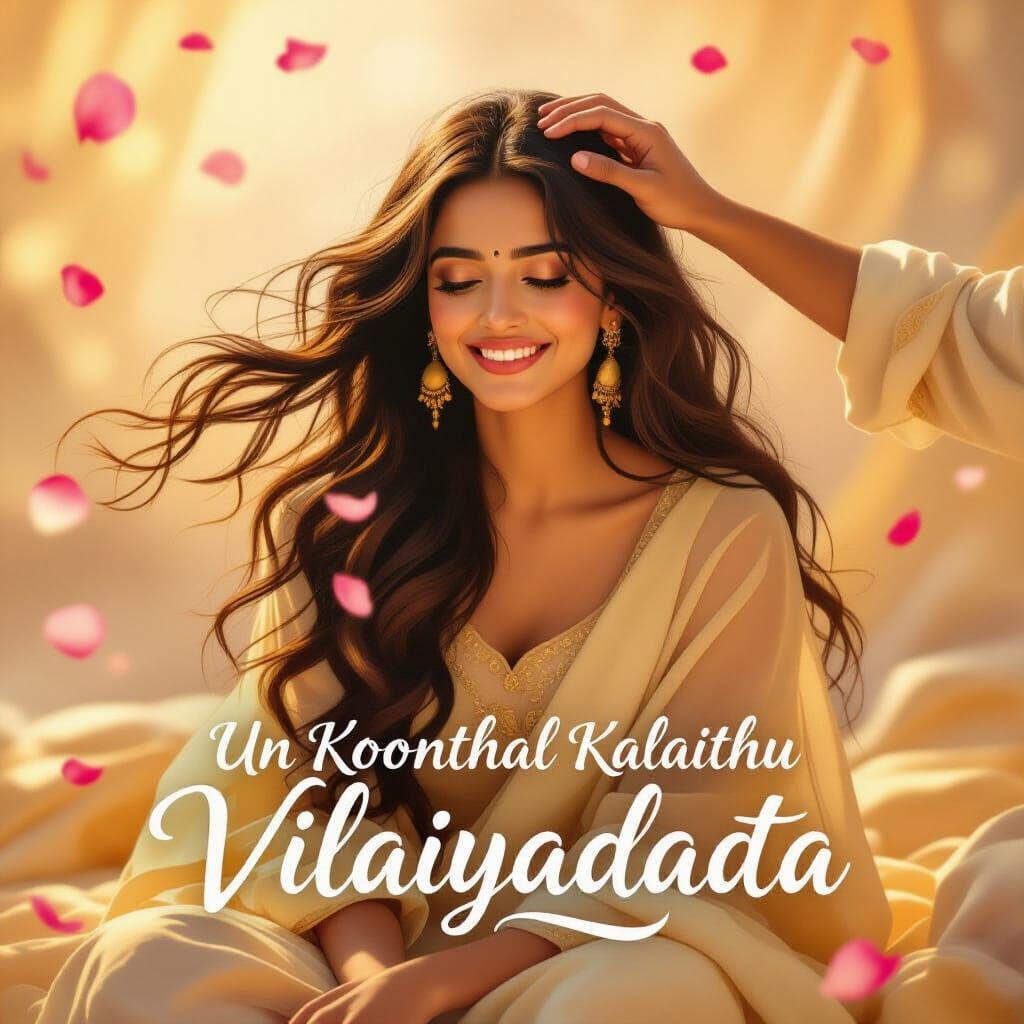 A joyful and serene South Asian woman sits in soft golden light as a hand gently touches her flowing hair. The scene blends cinematic romantic surrealism with warm pastel tones and glowing petals.