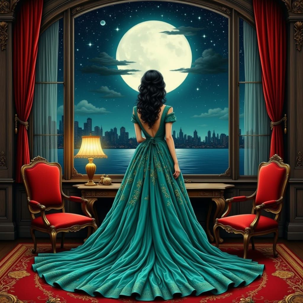 This image showcases an elegant woman in a detailed turquoise gown, looking out a window at a starry night sky and moonlit water. The scene evokes a romantic, cinematic mood with rich interior details.