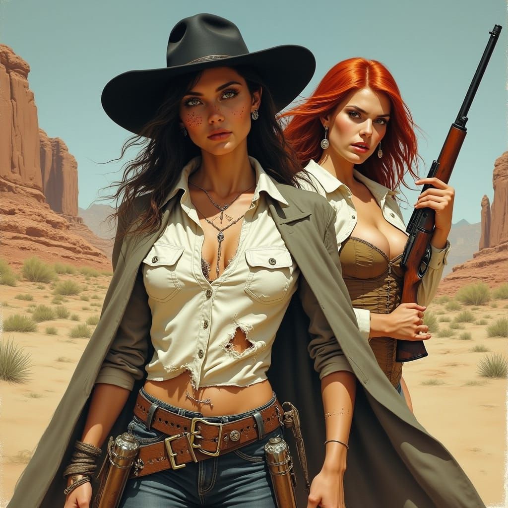 This image shows a female ghoul with a scarred cheek in a desert setting. She wears a cowboy hat and duster, armed with pistols and a rifle, protecting a red-haired woman with a gritty, worn aesthetic.