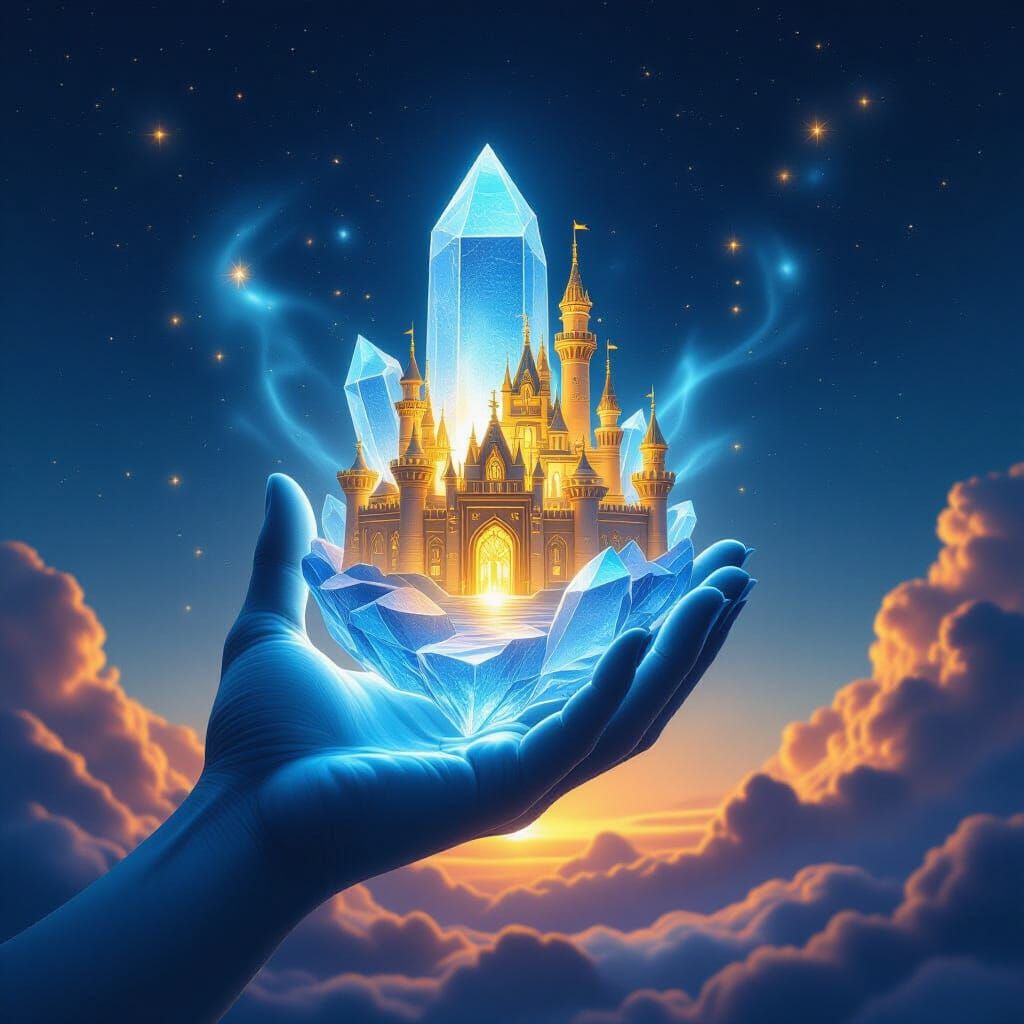 This digital matte painting depicts a glowing blue crystal hand grasping a golden castle, representing family and giving. Inspired by surrealism and dreamlike atmospheres, it features cinematic lighting and rich color gradients.