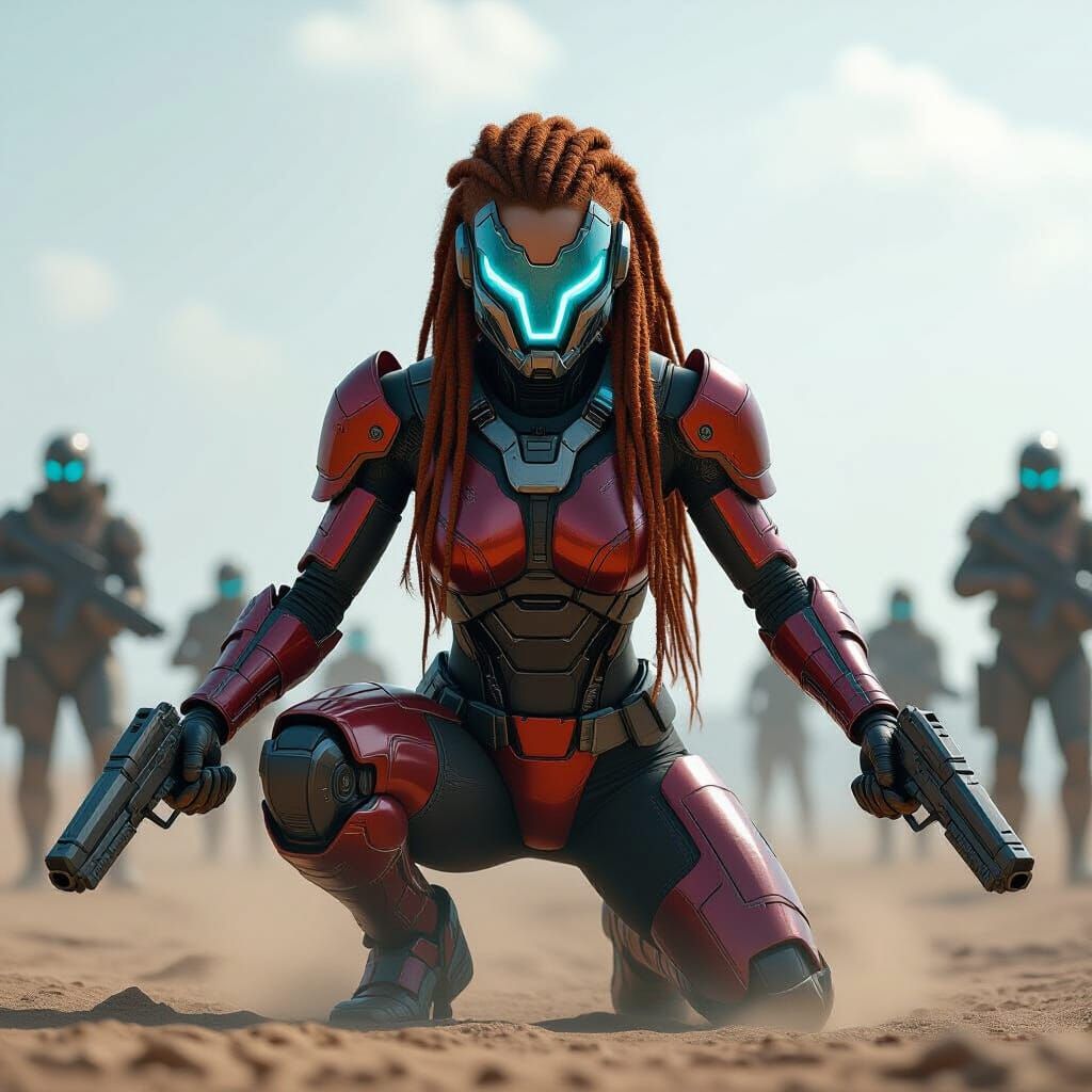 This image shows a female cyborg warrior with braided hair in a metallic and red armored suit. She holds two pistols in a crouched position against a dusty, overcast sci-fi background.