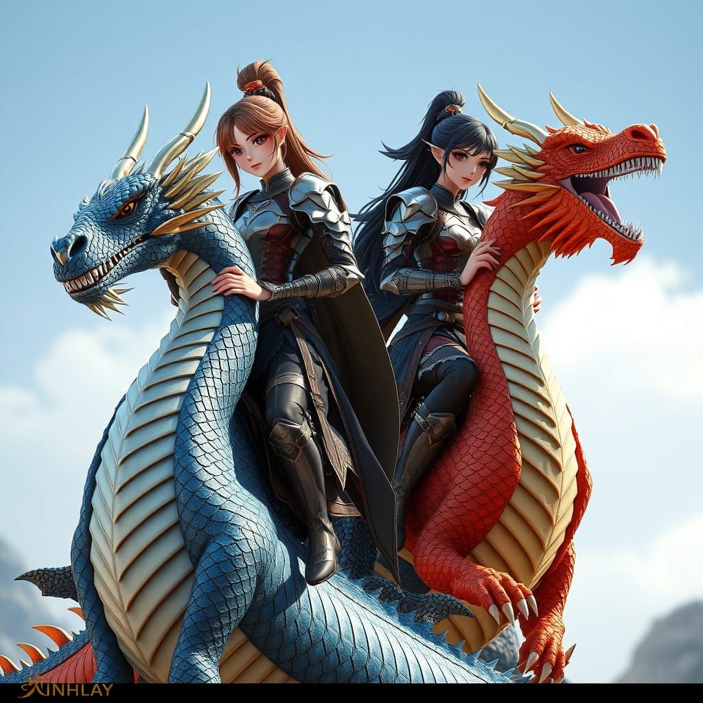 This image shows two female warriors in ornate leather armor sitting atop their dragons. The dragons, one blue and one orange, are rendered with fine detail in a 3D anime art style.