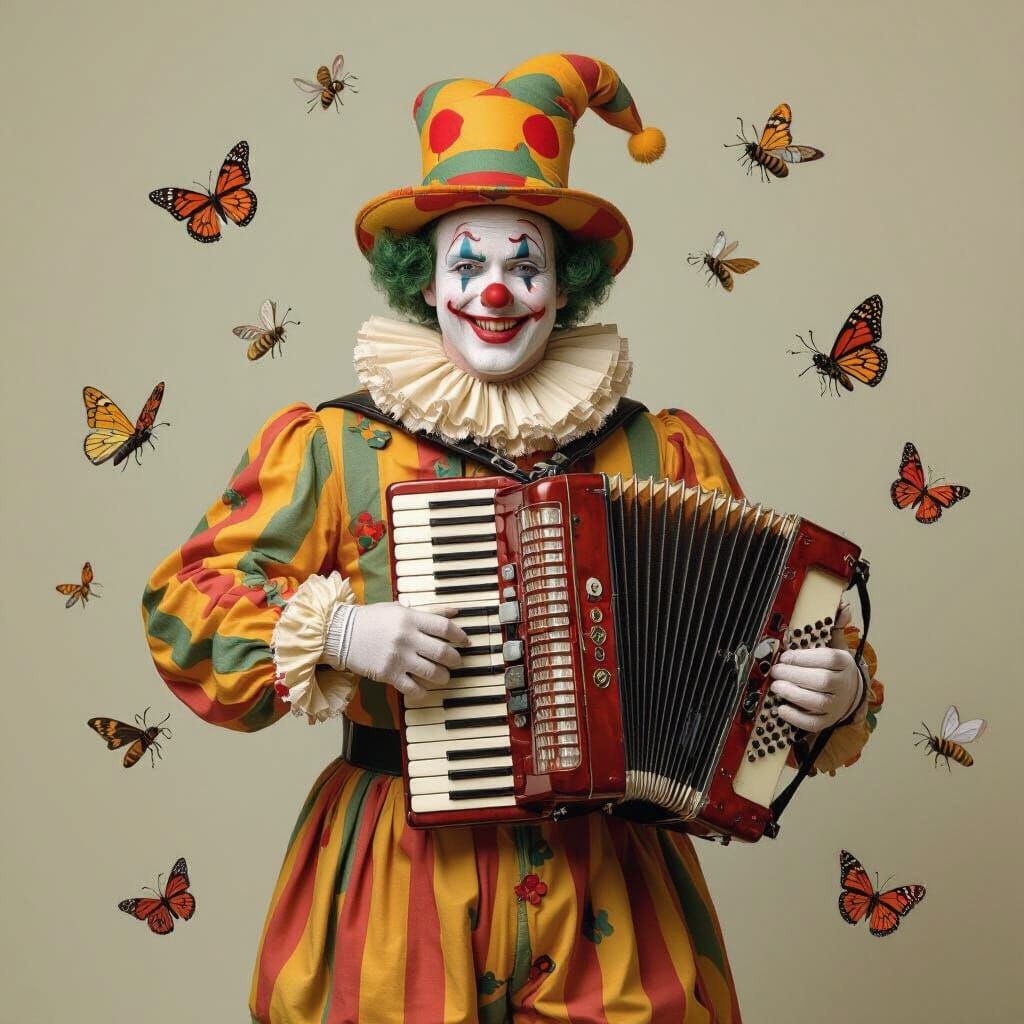 A vibrant image of a vintage clown in colorful attire playing the accordion, surrounded by dancing insects. Rendered with detailed textures and realistic colors, and metallic elements.