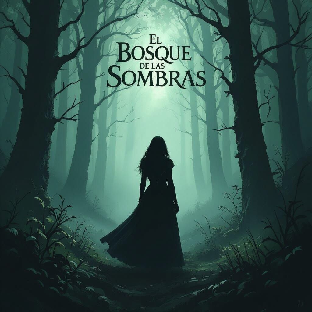 A woman stands in a dark, mysterious forest with deep green, black, and burgundy tones. Light rays pierce the light mist, creating a magical atmosphere with glowing trees.