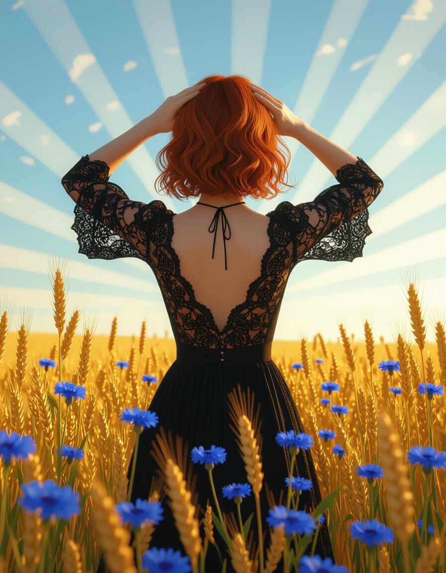 A woman with red hair in a black lace dress stands in a wheat field with cornflowers. The image is reminiscent of Pixar's 3D art style with cinematic lighting.
