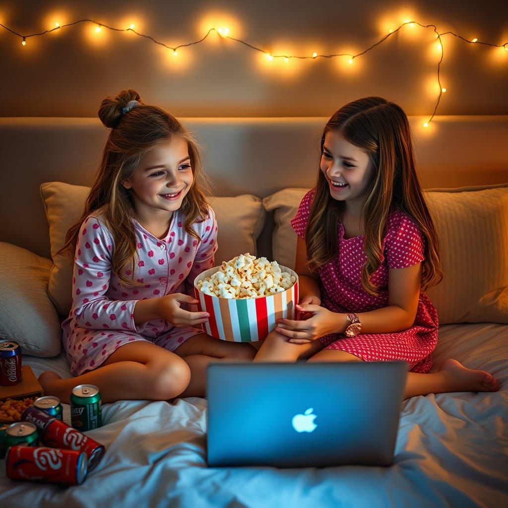 A heartwarming image of two young girls enjoying a movie night in a softly lit bedroom. The scene is filled with snacks and cozy details, creating a warm, intimate atmosphere as captured with a shallow depth of field.