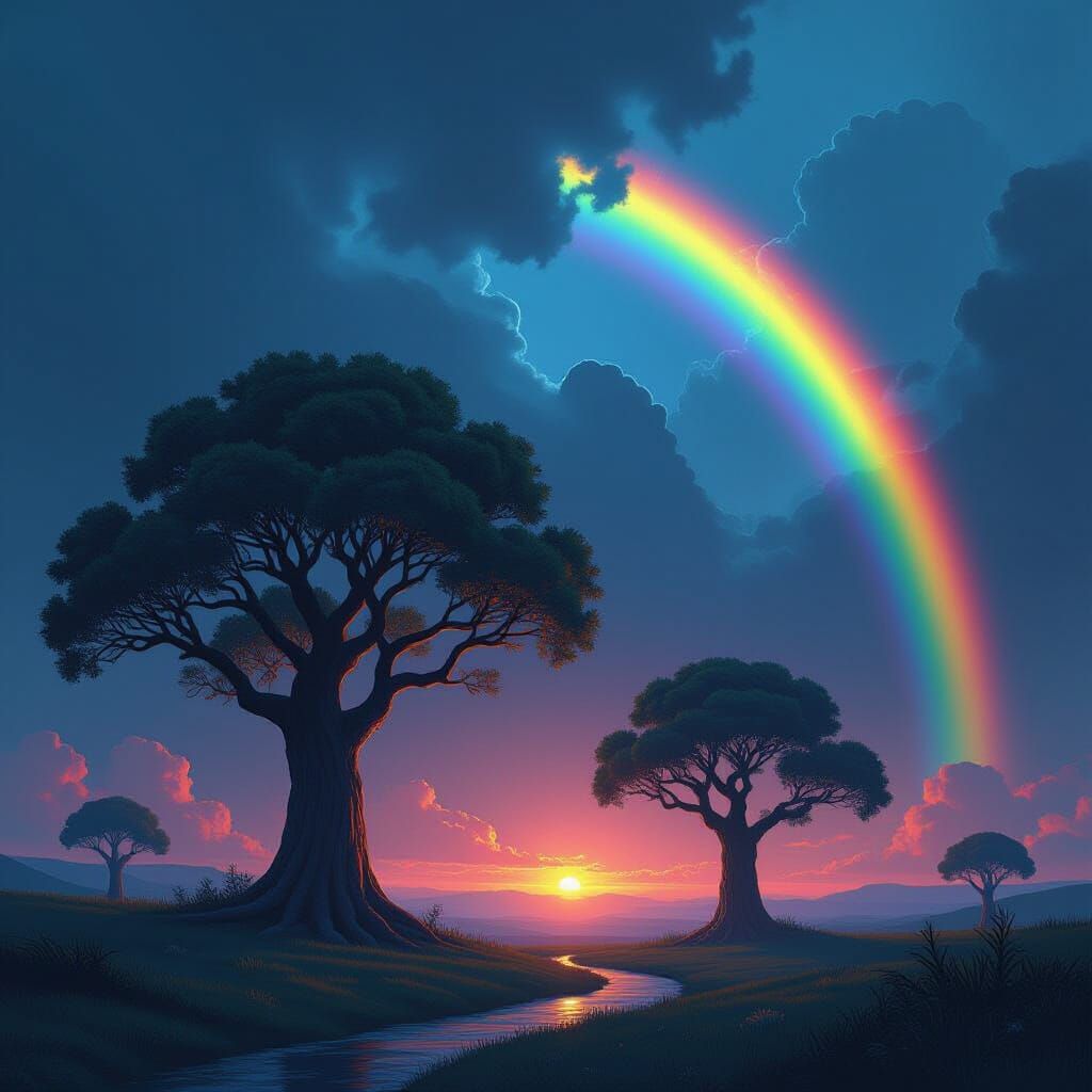 A captivating image of trees silhouetted against a dark sky, enhanced by a bright rainbow. This digital artwork features atmospheric and futuristic elements.