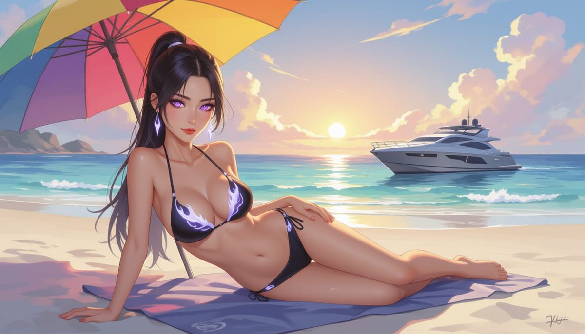 This image shows a detailed digital painting of a woman with glowing violet eyes and white flame accents, lounging on a beach with a futuristic yacht in the background. The scene features a dramatic sunset and painterly realism.