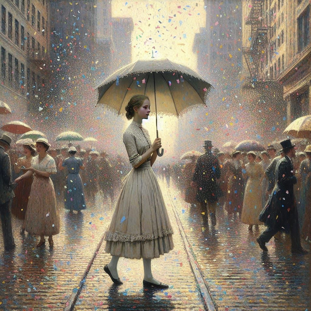 This image shows a young girl in a city street holding an umbrella under a shower of confetti, celebrating with a diverse crowd. The image is rendered in the style of American Realism.
