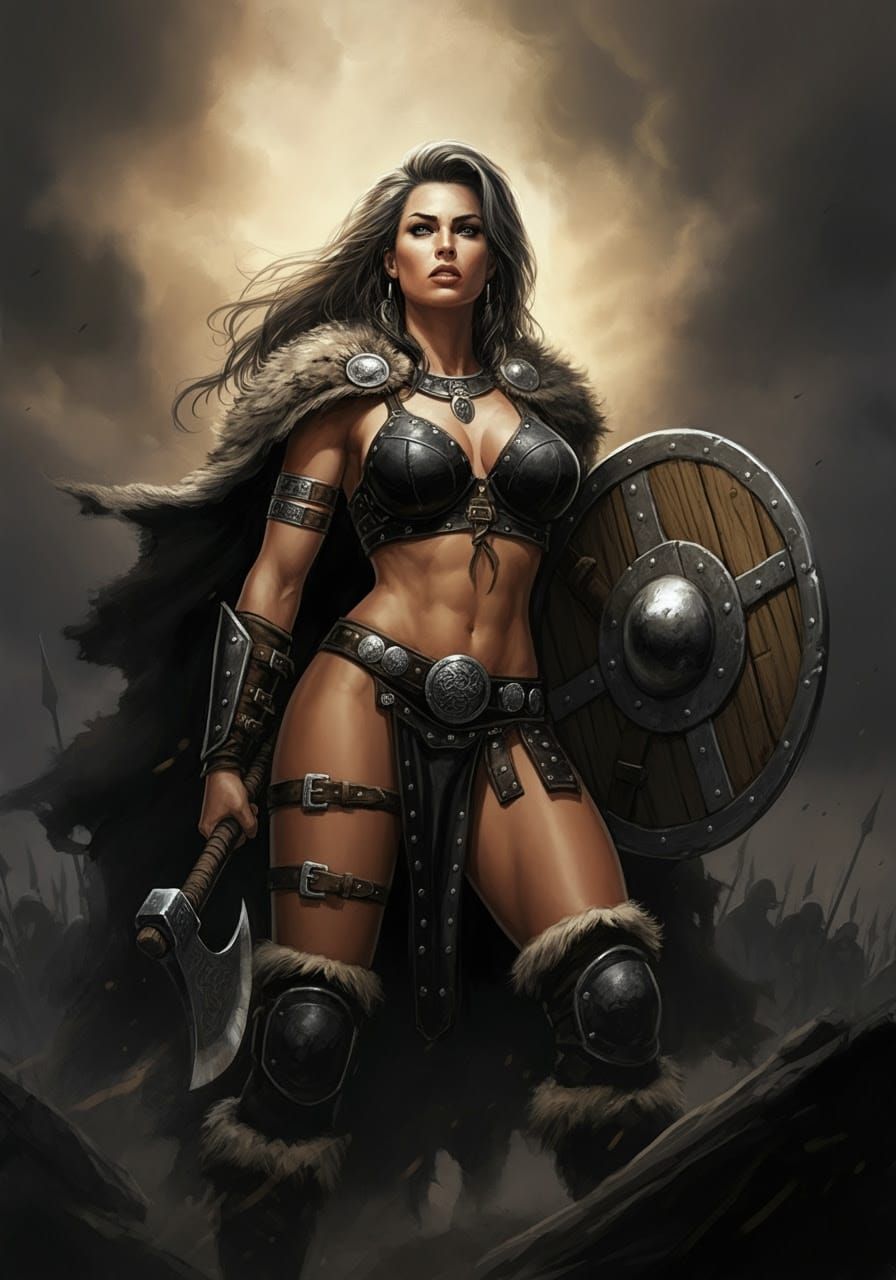 A striking picture of a female barbarian warrior in black leather bikini armor, wielding a shield and axe. The artwork is reminiscent of pencil sketches with bold lines and dramatic lighting.