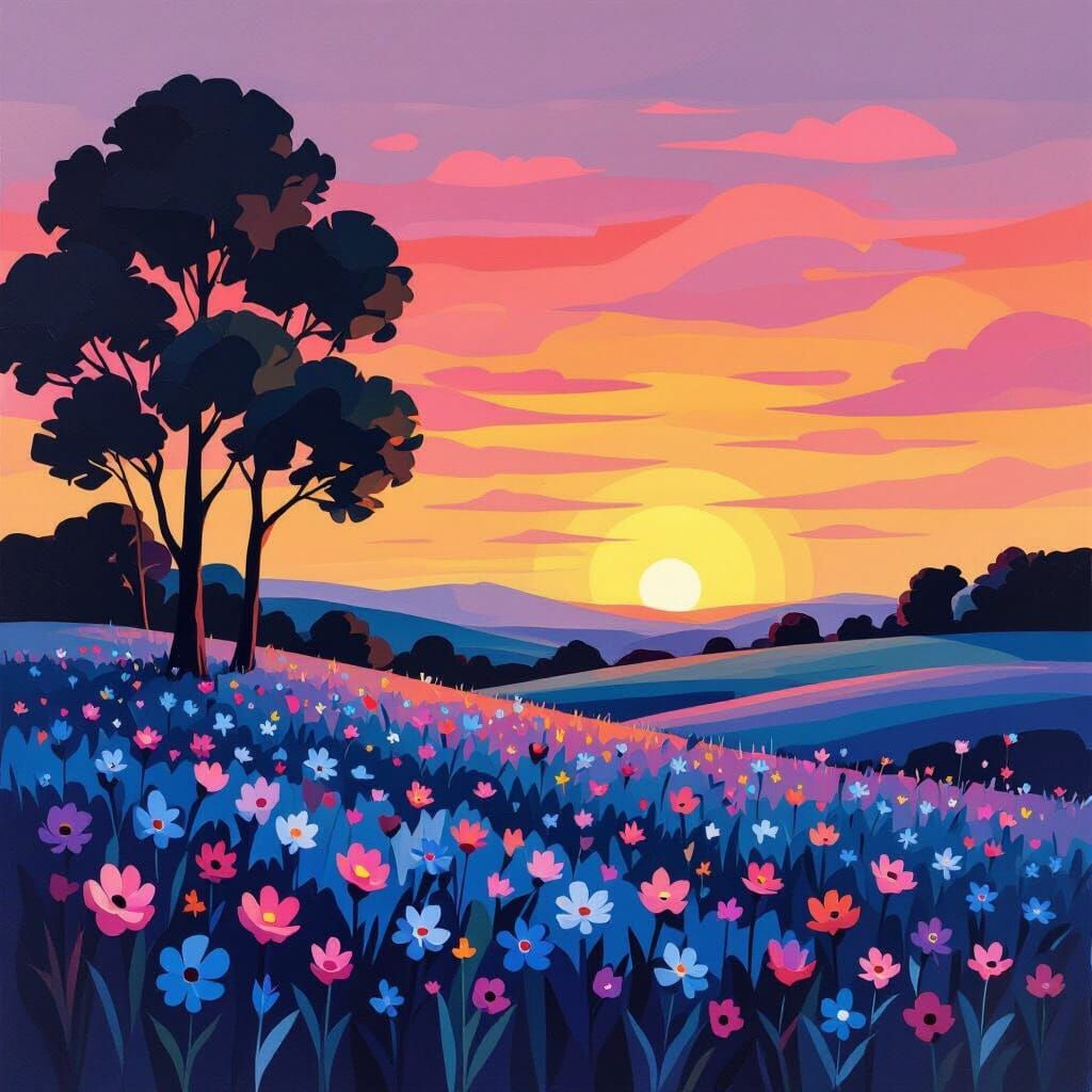 This image displays a stylized acrylic landscape with a glowing sunset in pink, purple, and orange over blue and violet fields. Geometric abstraction and bold colors create a modern, painterly feel.