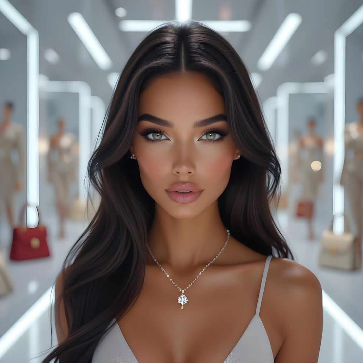 This image presents a stunningly realistic 3D portrait of a woman with tan skin and grey eyes, showcasing a futuristic mind filled with high fashion and luxury.