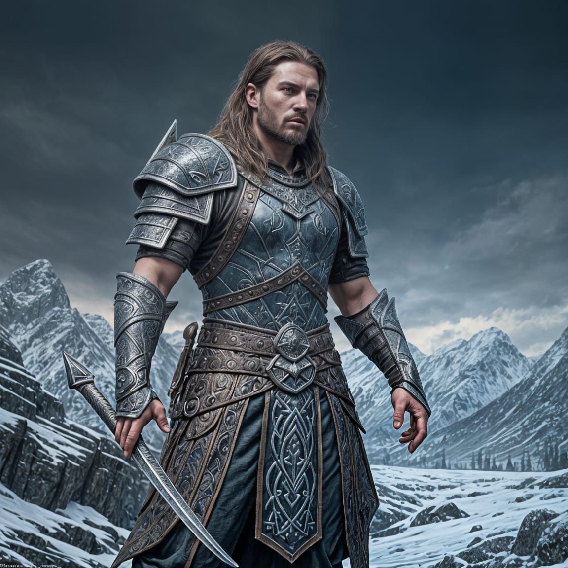 high fantasy epic male viking templar warrior, dark chainmail armor, battle stance, scenic winter background, high detail, high quality, correct anatomy, 8k resolution concept art portrait by Greg Rutkowski, Artgerm, WLOP, Alphonse Mucha dynamic lighting hyperdetailed intricately detailed Splash art ...
