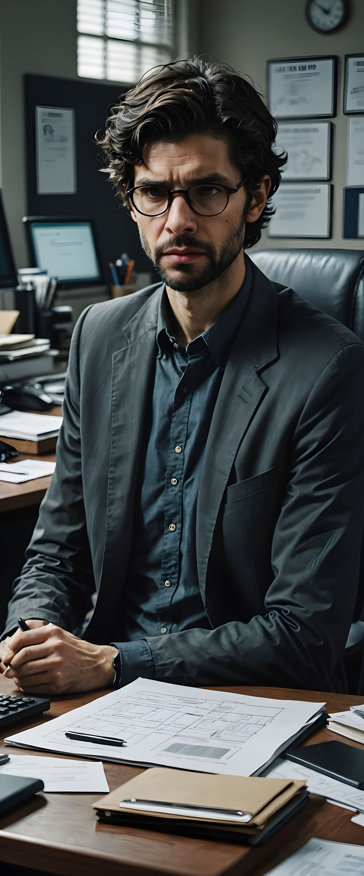 A photorealistic film noir image of a sad, awkward, forty-year-old Caucasian man resembling Ben Whishaw. The researcher-type is sitting in a chaotic empty scientific office in 2019.