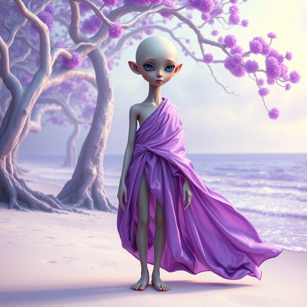 This serene image captures a slender, hairless being with delicate features, standing on a beach surrounded by iridescent purple hues, glowing trees, and vibrant flowers. The being radiates kindness and wisdom, embodying the essence of their mystical world.