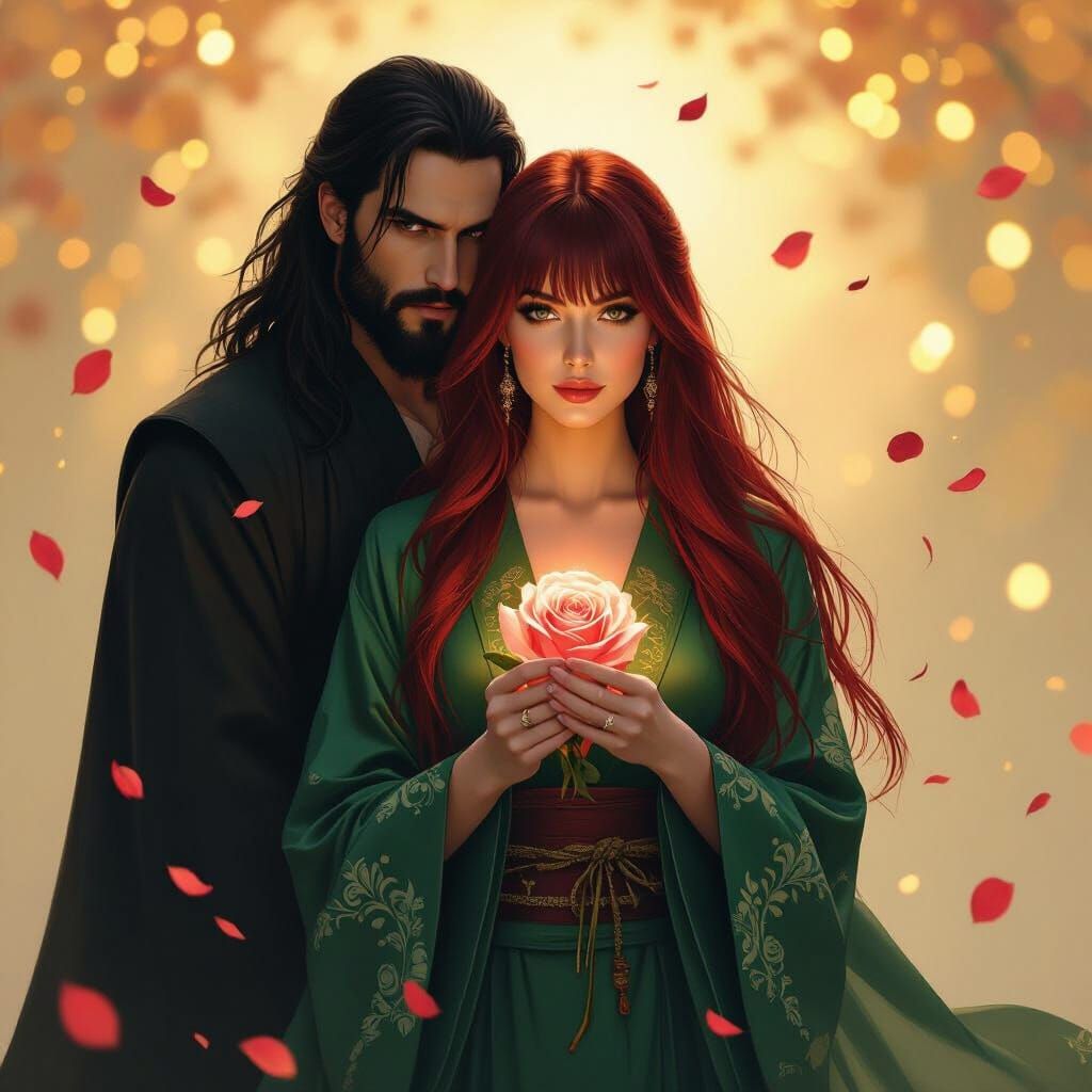 This image shows a woman in a green kimono holding a glowing rose, with a man behind her. The artwork is reminiscent of fantasy concept art with rich colors and a dreamy, ethereal atmosphere.