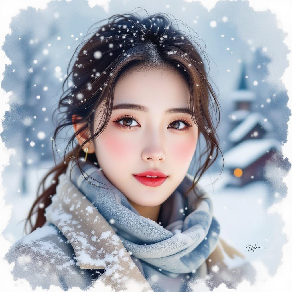 A striking picture of a young Korean woman with expressive eyes, her serene face softly blending into a snowy winter landscape in watercolour style. The image evokes wistfulness with emotional brushstrokes.