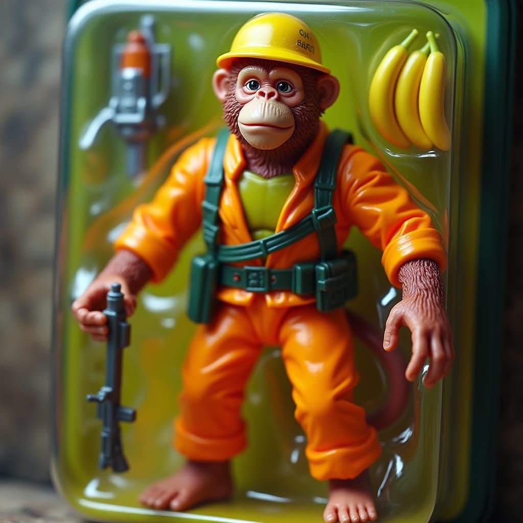 This nostalgic image captures a heroic action figure in vibrant orange and yellow jungle attire, grasping banana grenades, with rich cinematic lighting reminiscent of 35mm film, and a sense of epic drama, blending nostalgia with high-octane action.