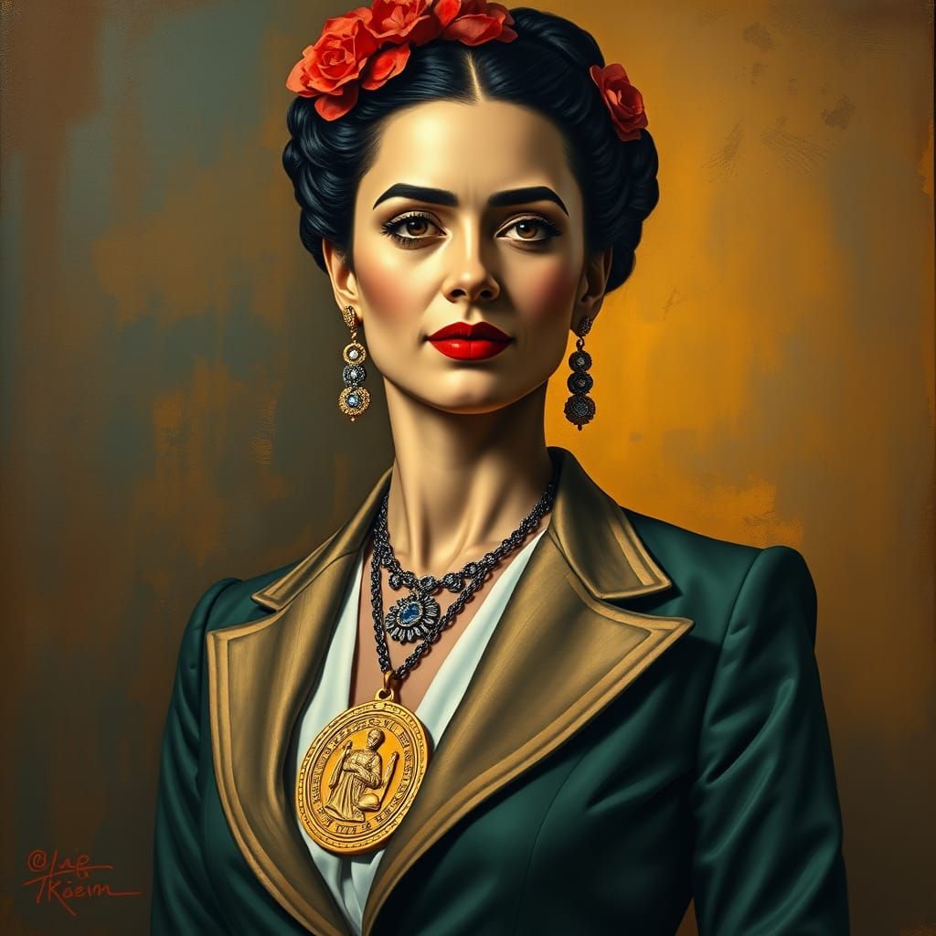This image depicts a confident woman wearing an elegant outfit and a gold Saint Benedict medal, set against a warm-toned background with dark wood textures, blending elements of Mexican realism, symbolism, and expressionism.