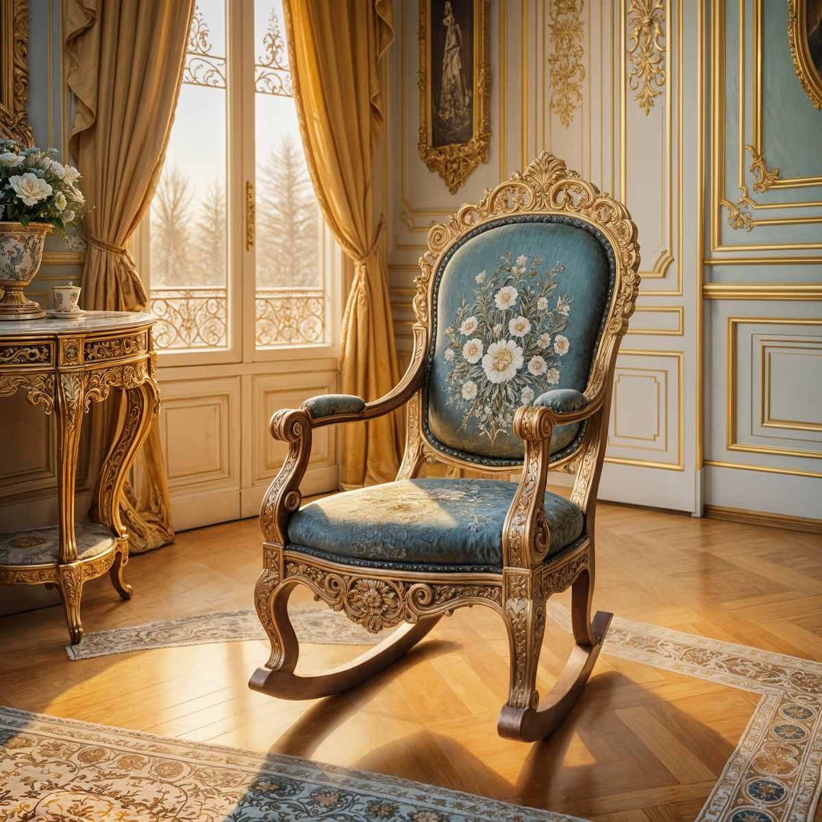 A gorgeous Belle Epoque rocking chair sits within an ornate Romanian palace. The image is an architectural sketch featuring soft winter illumination and intricate details, rendered with bright gouache in the style of Gustav Klimt.