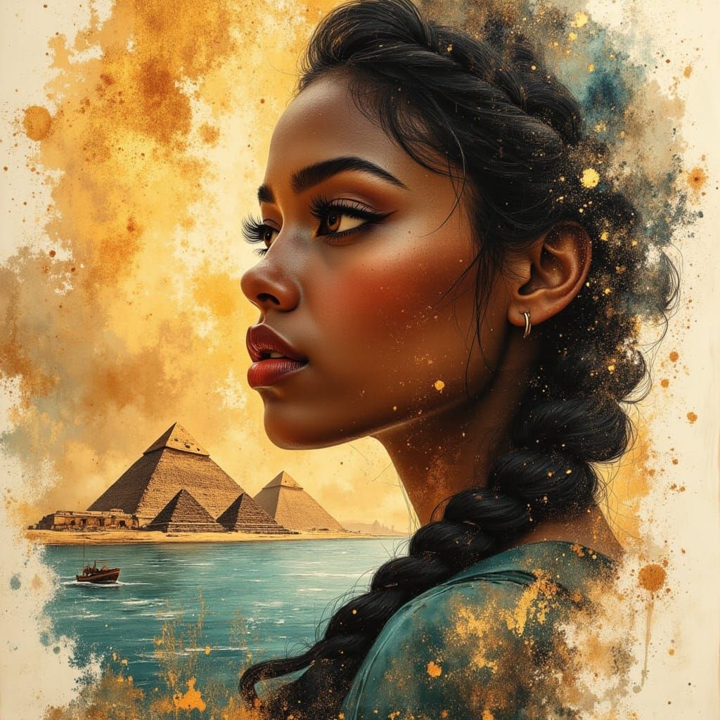 This image features a beautiful African Egyptian goddess with sun-kissed skin and intricate makeup, rendered with crisp lines and vibrant colors. A unique double exposure blends pyramids and the Nile into the portrait.