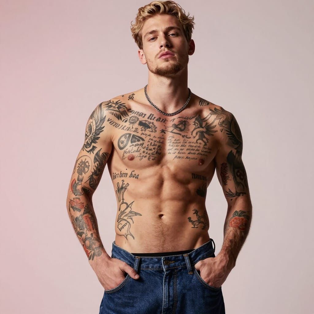 A striking image of a handsome, slim-fit Nordic man with a studio-like pink background. His body is a canvas for intricate, layered tattoos covering his chest, shoulders, arms, and abdomen.