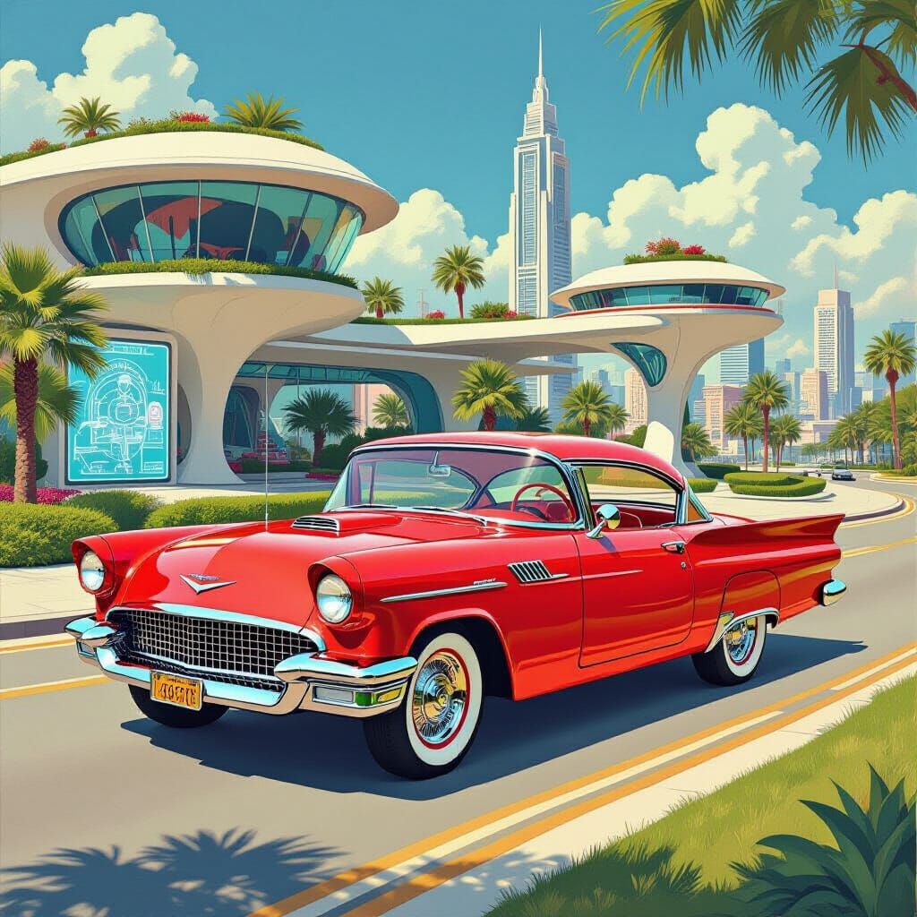 A vibrant cherry red hot rod cruises a sunlit street. Sleek architecture, rooftop gardens, and holographic ads blend vintage and futuristic styles as bold impressionist art.