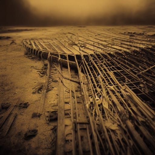 This haunting image captures a close-up portrait in a gritty, high-fashion aesthetic, with a blend of decaying sepia tones and vibrant, triadic color scheme, reminiscent of abstract expressionism and biomechanical art.