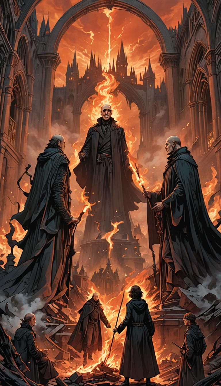 A dramatic scene of three young wizards confronting a dark figure in a burning castle. Digital artwork evoking a mystical atmosphere with volumetric effects, rich colors, and hyperdetailed textures.