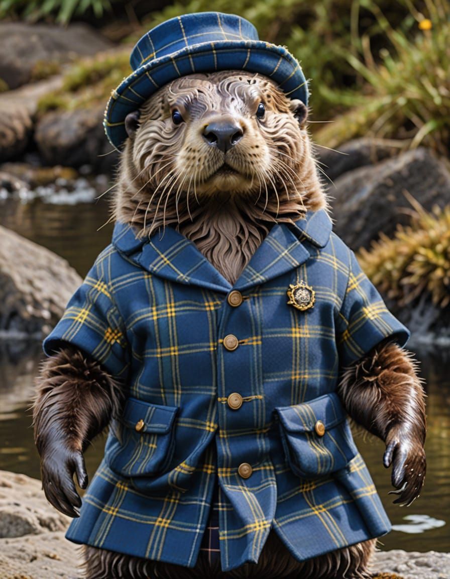 This image features a proud sea otter dressed as a Highland Scotsman, complete with a traditional tartan outfit showcasing blue, white, and yellow patterns.