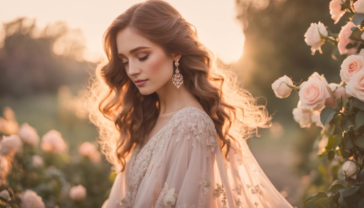 A serene portrait photography of a woman in a flowing pastel gown, surrounded by delicate roses. Features warm golden hour light and tender, dreamy eyes.