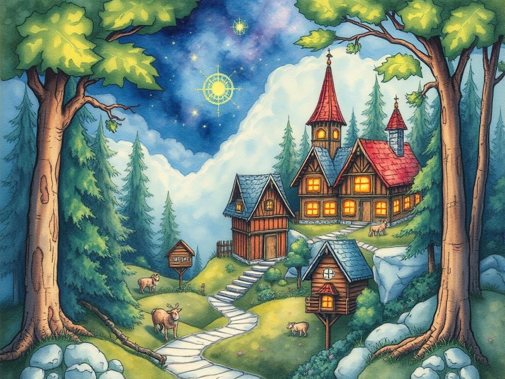 This image showcases a detailed, intricate fantasy forest village rendered in a watercolor painting style with astral expressionist shimmers.