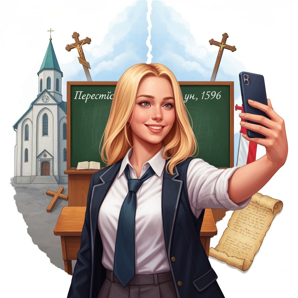 This image shows a blonde schoolgirl taking a selfie in a classroom. The blackboard displays "Берестейська унія, 1596", amidst Orthodox and Catholic symbols, in a semi-realistic style with vivid colors and textures.